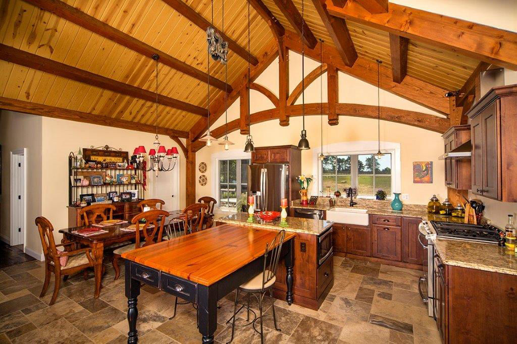 The dark Doug fir timbers are a striking contrast against the lighter color tongue and groove ceiling. Mixing different wood tones accentuates the timber work and make a major impact in this small eat-in kitchen.
